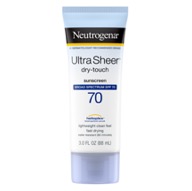 Neutrogena Ultra Sheer Dry-Touch Sunscreen SPF 70, It goes on easily and absorbs quickly for an invisible, light-weight feel on your skin. Offering superior broad spectrum protection from aging UVA rays and burning UVB rays. $11.99 at https://www.neutrogena.com/